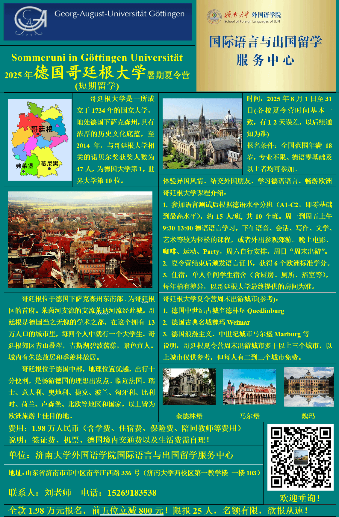 mk体育国际语言与出国留学服务中心致力于服务社会,在全国范围内组织在校老员工前往德国参加2025年暑期德国哥廷根大学夏令营(短期留学)。该项目旨在满足有德语语言学习以及德国(欧洲)旅游需求的在校老员工到德国实地进行德语学习和游历,促进中德交流发展,提高员工德语语言水平以及为留学德国提供考察机会。