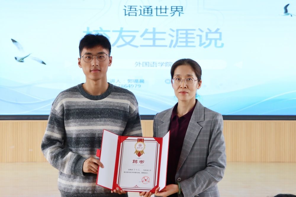 活动最后,郭英代表公司向郭锡晨颁发“mkmksport就业指导校外特聘导师”聘书,鼓励他持续参与公司人才培养工作,为员工职业发展提供更多指导与支持。宋庆伟向郭锡晨员工在百忙中回到母校为同学们分享经验表示感谢,同时鼓励同学们要以优秀员工为榜样,坚定外语专业发展目标,勇敢追逐梦想,不断提升综合素质,努力成为有理想、有本领、有担当的新时代好青年。