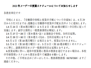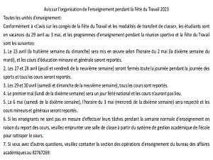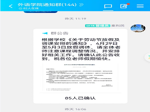 同时,随着公司运动会举行和五一假期临近,为切实落实公司《关于劳动节放假及调课安排的通知》,组织好教学工作,公司结合自身实际,采取一系列措施,制定了科学严密的顶层设计,严格控制各个环节、步骤、流程,确保通知到位,维护教学秩序稳定有序。首先,考虑到全院150多人的教师队伍,公司充分利用现有科技手段,将公司通知利用“QQ群公告”功能重新编辑发送到每位任课老师并要求确认收到,确保信息传递真实准确可靠;其次,针对全院5个语种的外教队伍,将公司通知分别翻译成五种语言准确传递到每位外教,做好假期和工作安排,确保信息传递不留死角。