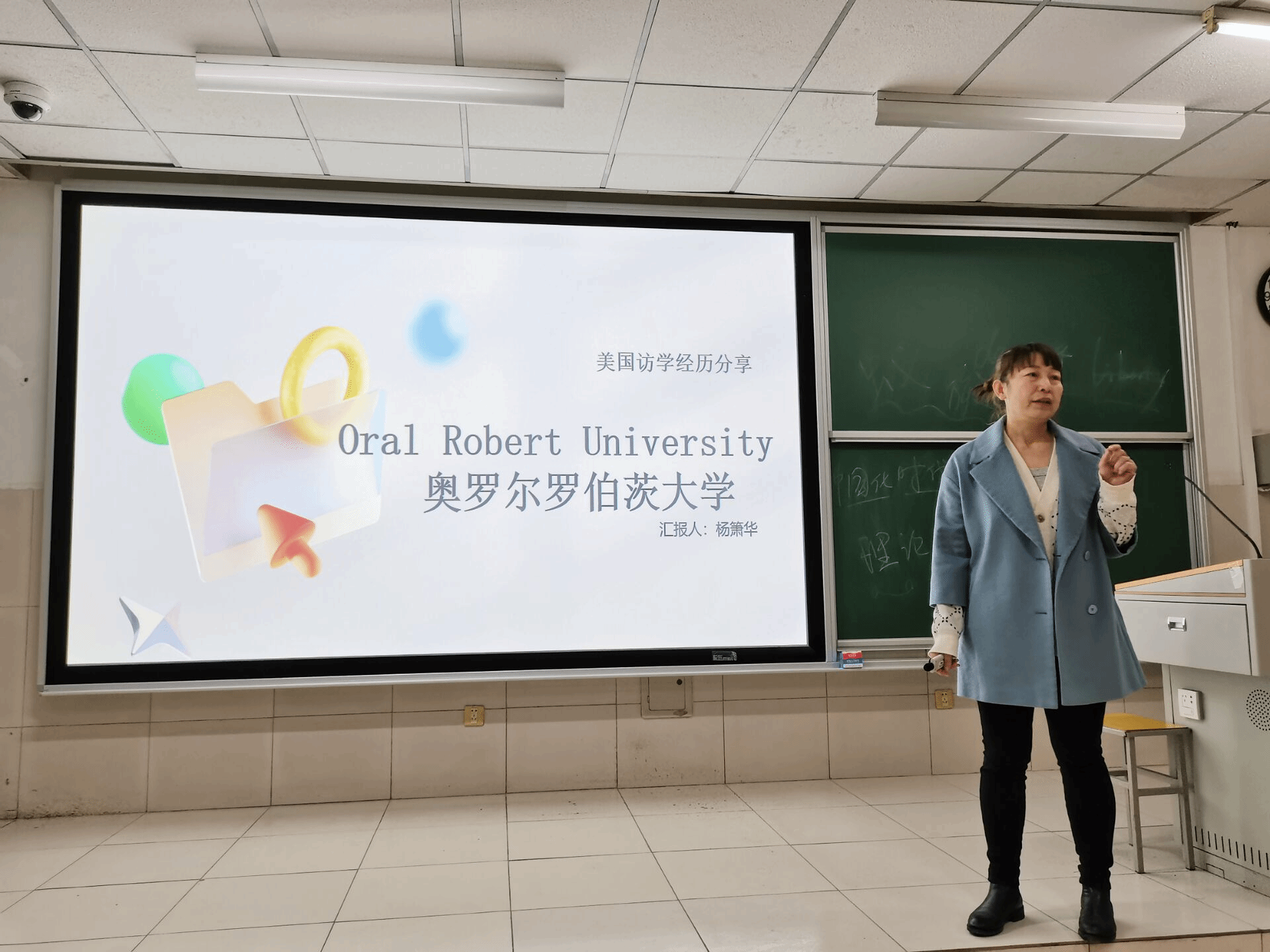 随后,23级组刚刚访学返校的杨箫华老师做了题为《美国访学经历—奥罗尔罗伯茨大学》的讲座。杨箫华老师分别从其申请公司、选修的课程、合作导师、文化传播、学术研讨等方面介绍了她在美国的访学经历和所见所闻,并分享了美国大学的一些先进的教学方法及工作趣事。