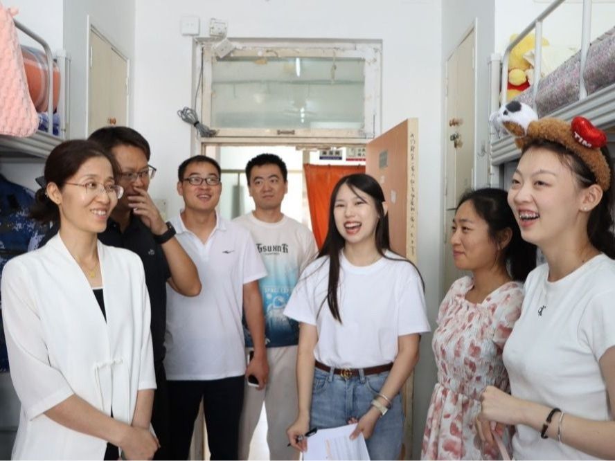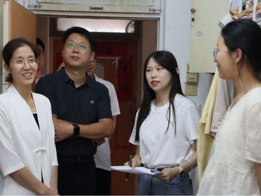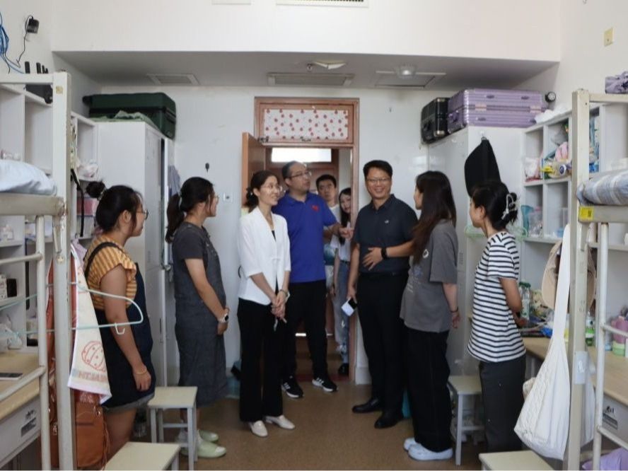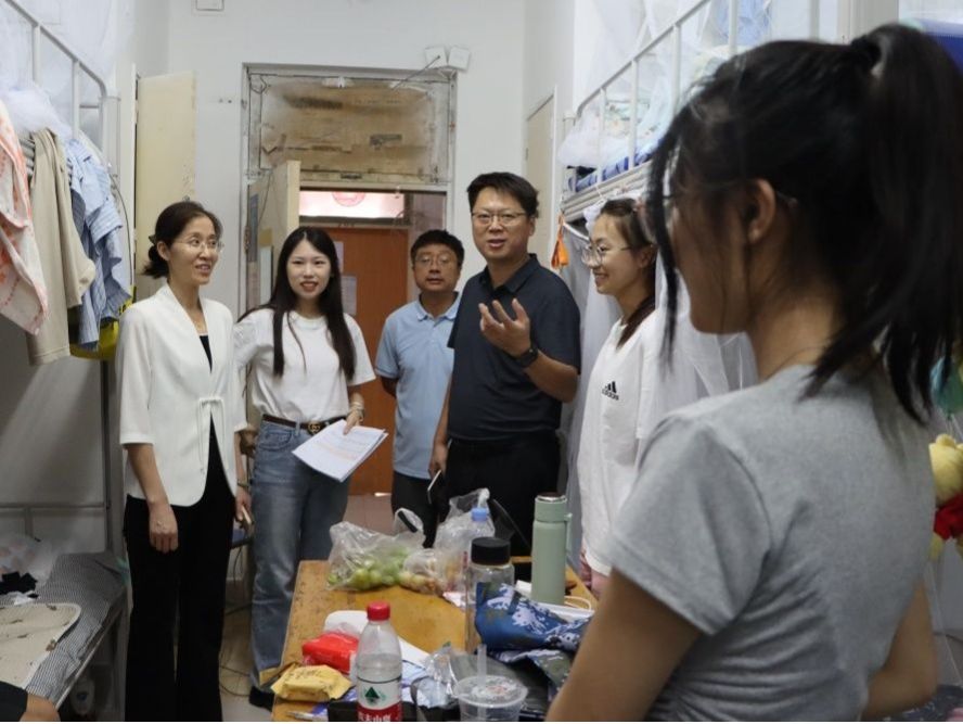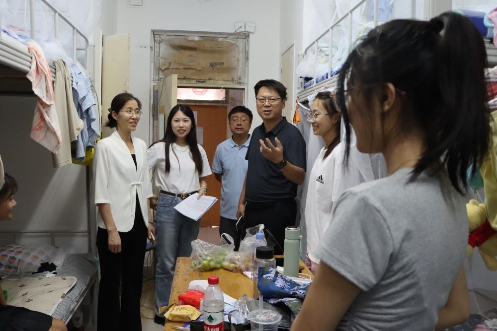 一行人逐一走访了本科生和研究生新生宿舍。郭英与新生们进行了亲切交谈,详细询问了同学们对宿舍和校园环境的适应情况,叮嘱同学们要在新环境中互相照顾、互相学习、互相督促,同时务必重视卫生及安全问题,并嘱咐同学们如有困难、有问题务必及时向辅导员们反映。