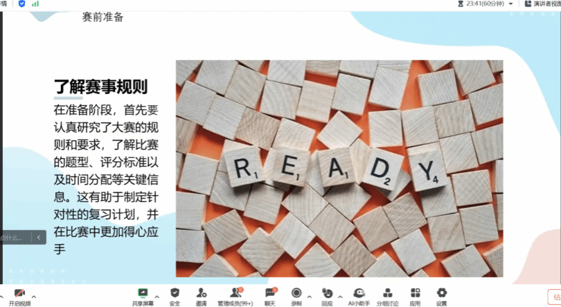 首先,罗静同学结合自己的参赛经验向参赛选手们介绍了自己的答题策略和时间分配,让参赛者更深入了解此次大赛的侧重点与参赛策略。随后,翁羽瑶同学以自己参赛经历为例,分享了赛前准备、备考方法和参赛历程英语学习方法以及考试答题策略。活动最后,两位同学耐心地解答了同学们的问题。