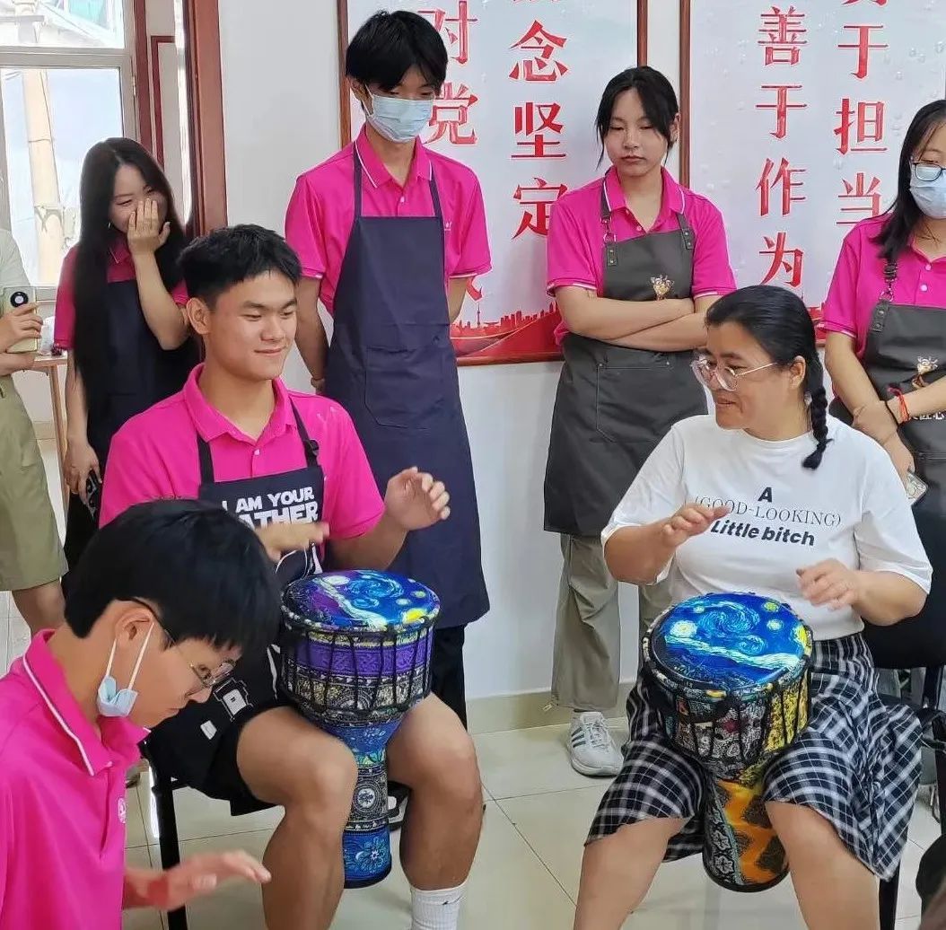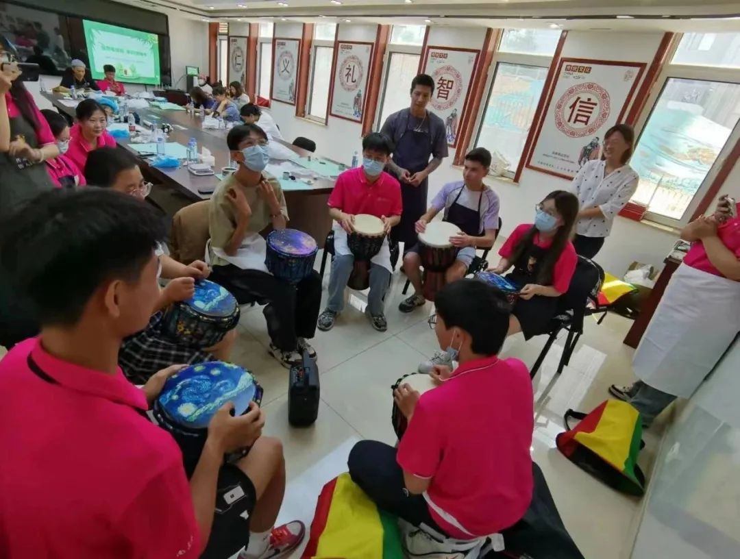 活动间隙,同学们还体验了非洲鼓,在宋老师的指导下学习了《哔哩哔哩》的拍法。这首曲子充满活力,与非洲鼓的节奏完美结合,让在场的每一位学员都沉浸其中。青年们全神贯注地敲打着非洲鼓,脸上的笑容和快乐的氛围相互感染,构成了一幅美妙的画面。