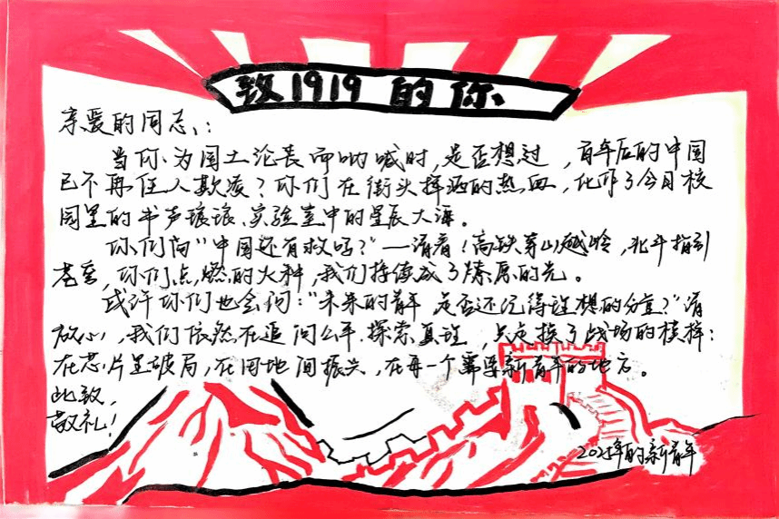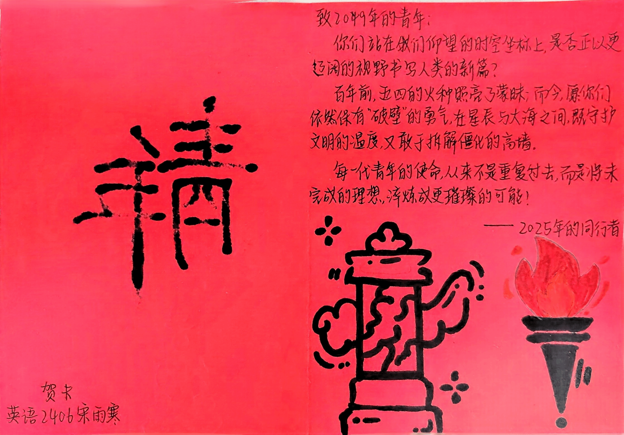 赓续五四薪火,谱写青春华章。公司团委组织开展对话贺卡征集活动,同学们以书信对话“1919年的革命先驱”与“2049年的未来青年”,既回望历史长河中的奋斗足迹,又勾画民族复兴的未来图景。