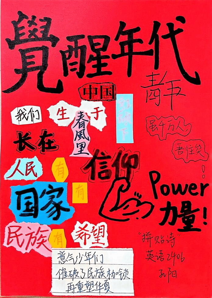 诗绘五四情,拼贴青春志。在拼贴诗大赛中,同学们将废旧报刊解构重组,以诗句拼贴出饱含爱国主义、创新探索精神的青春宣言,用创意诠释五四精神的时代新内涵。
