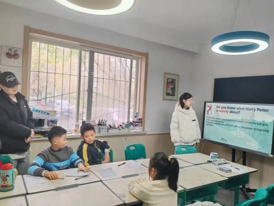 在此次活动中,志愿者们从小朋友的兴趣与爱好入手,通过讲故事、游戏互动等形式,让小朋友们遨游在英语知识的世界里。课堂上,志愿者用英文讲述了小朋友喜欢的哈利波特的故事,他们感到新奇的同时,促使他们留下深刻印象;在游戏互动环节,志愿者们通过引导孩子用自己可以表达的英文来描述自己喜欢的人物,同时让大家一起根据描述来猜一猜描述的是谁。这一环节不仅调动了他们学习的积极性和主动性,展现出小朋友们较强的理解和学习的能力。