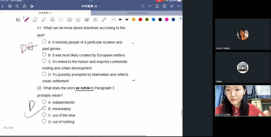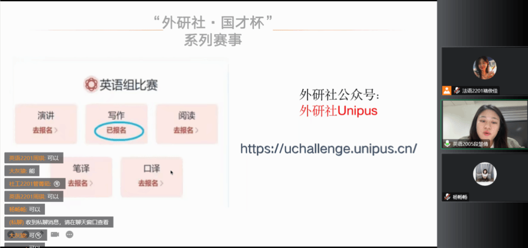 本次分享会邀请了英语2005班段慧倩同学,她结合自己的参赛经验向参赛选手们介绍了自己的参赛历程,并从写作的重要性、备考策略如何到使用策略,让参赛选手对英语写作比赛有了进一步了解;2023届优秀毕业生庒梦娜,曾获得2022外研社·国才杯英语阅读比赛国赛二等奖,她以自己参赛经历为例,分享了自己的阅读英语文章习惯、英语学习方法以及考试答题策略。同时希望参赛同学从平时英语阅读积累着手,养成良好的阅读习惯。活动最后,两位同学细心、耐心的解答了同学们的问题。