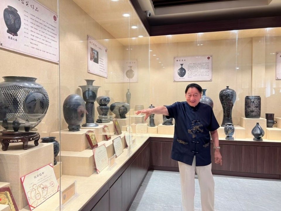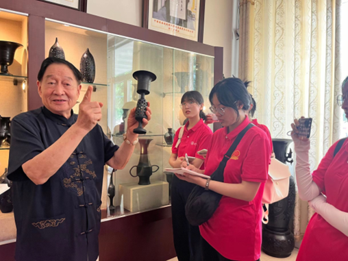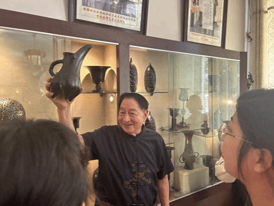 实践团队走进济南德功黑陶艺术馆实地参观了解黑陶非遗文化。到达体验馆后,刘德功老先生亲自带领着团队成员参观了艺术馆,为大家讲解黑陶发展历史和制作流程,同时向成员们展示古代以及现代的黑陶手工艺品。陶鬶、蛋壳杯、陶甗等一件件手工艺品陈列在展柜里,九千年的民族记忆镌刻在每一片陶片上,传统技艺与现代文化相结合,一脉相承的文化体现作品上,包含着对传统文化的信仰与尊崇。