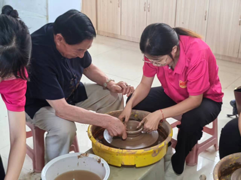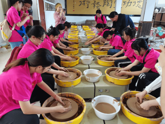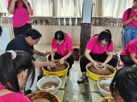 参观完黑陶艺术馆,刘老师带领实践团队成员参观了黑陶的制作现场,工人们在细细地雕刻已成型的陶罐,每一步都需要十分的小心,一点点的差错都会让所有的努力化为虚无。随后,在刘老师的指导下同学们亲手体验把泥块放到成型机上拉胚成型的过程,过程虽然很难,但同学们都兴致高涨,在刘老师的指导下逐渐将手中的泥块拉成各式各样的造型。无论是基础的拉胚,还是后续的烧瓷,雕刻等,黑陶制作的工艺过程需要极其耐心,每一步都需要精心打磨,每一件黑陶物件背后折射的都是工艺传承人的道义坚守与工匠之风。