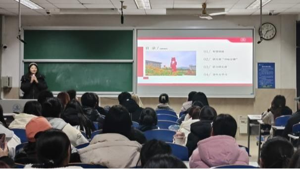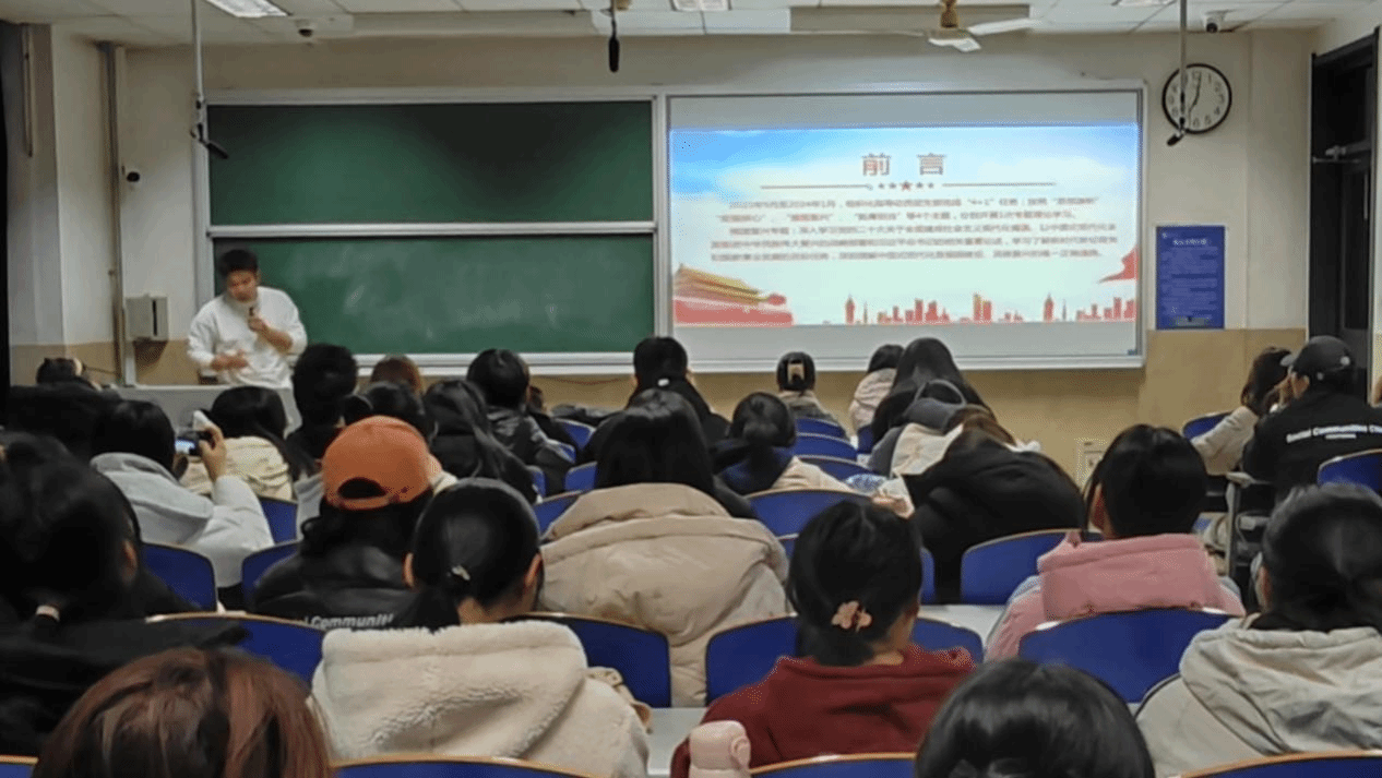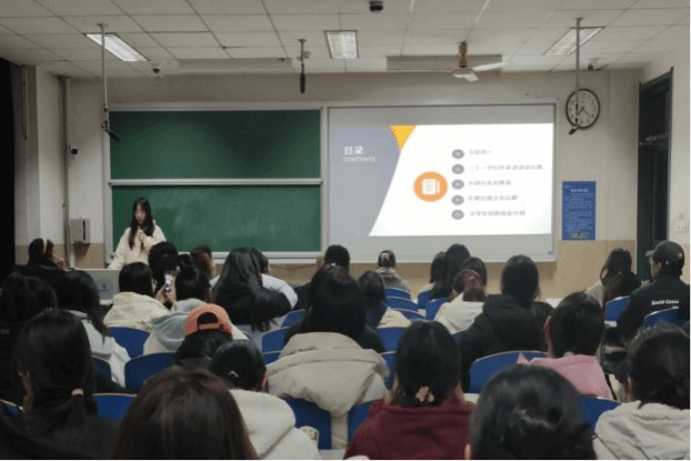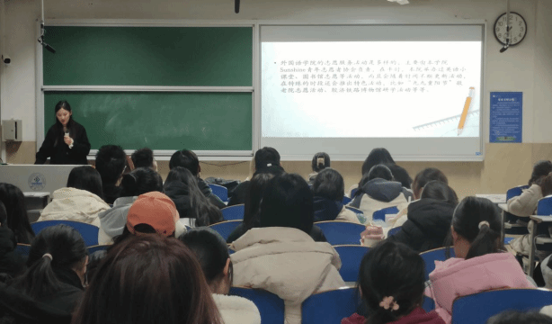 接下来,公司员工会组织部葛依娜解读了“智慧团建”系统操作流程,讲解了“团支部对标定级”、“活力团支部”等相关工作要求,介绍了优秀团支部、团干部等评奖评优的申报条件;科创部周琪对各类科技创新赛事进行了解读,并分享了近几年外语公司在各类赛事中取得的成绩,鼓励同学们积极报名参与科技创新比赛,锻炼自己的创新实践能力;青年志愿者协会郭凤娇分享了协会曾组织的胶济铁路博物馆研学、“趣味英语进社区”等志愿服务活动,鼓励同学们积极参与到志愿服务活动中,提升自身的精神素养与实践能力。