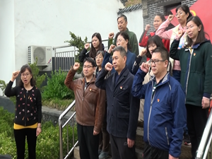 参观完主场馆后,大外第一支部党员聚集到纪念馆正门内的巨型党徽旁,面对党旗,庄严地高举右拳,重温入党誓词。铮铮誓言见证了我们的庄严承诺和坚定信仰,心灵也在党旗下接受了净化和洗礼。重温入党誓词后,大家又唱起了红歌。