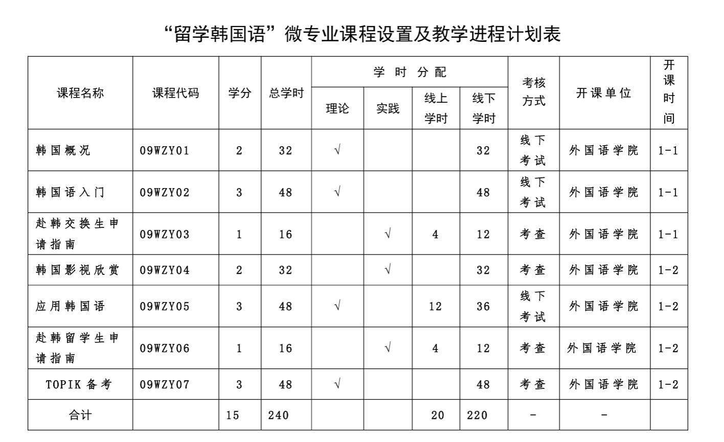 “留学韩国语”微专业课程修读时间为1学年。成绩单独管理,不计入主修专业成绩单。完成全部课程修满学分的同学可获得公司颁发的“留学韩国语”