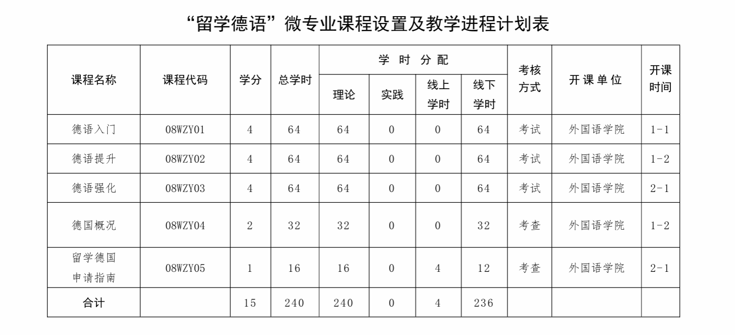 “留学德语”微专业课程修读时间为3个学期。成绩单独管理,不计入主修专业成绩单。完成全部课程修满学分的同学可获得公司颁发的“留学德语”微专业证书。微专业不在中国高等教育员工信息网(学信网)备注信息,不具有学士学位授予资格。